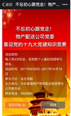 (物產(chǎn)配送公司 訊 龐玲/文)為了迎接黨的十九大勝利召開,物產(chǎn)配送公司黨委在9月8日-10月18日期間開展"喜迎黨的十九大"微信公眾平臺(tái)黨建知識(shí)答題活動(dòng)。