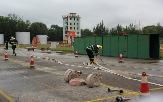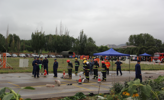 本次比武競賽共有42支隊伍參加,我公司平安消費品市場參加了一人兩盤水袋連接操、原地著滅火防護服百米負重跑個人技能比賽項目和手提式干粉滅火器滅油槽火操、固定消防設施撲滅初起火災操集體比賽項目。